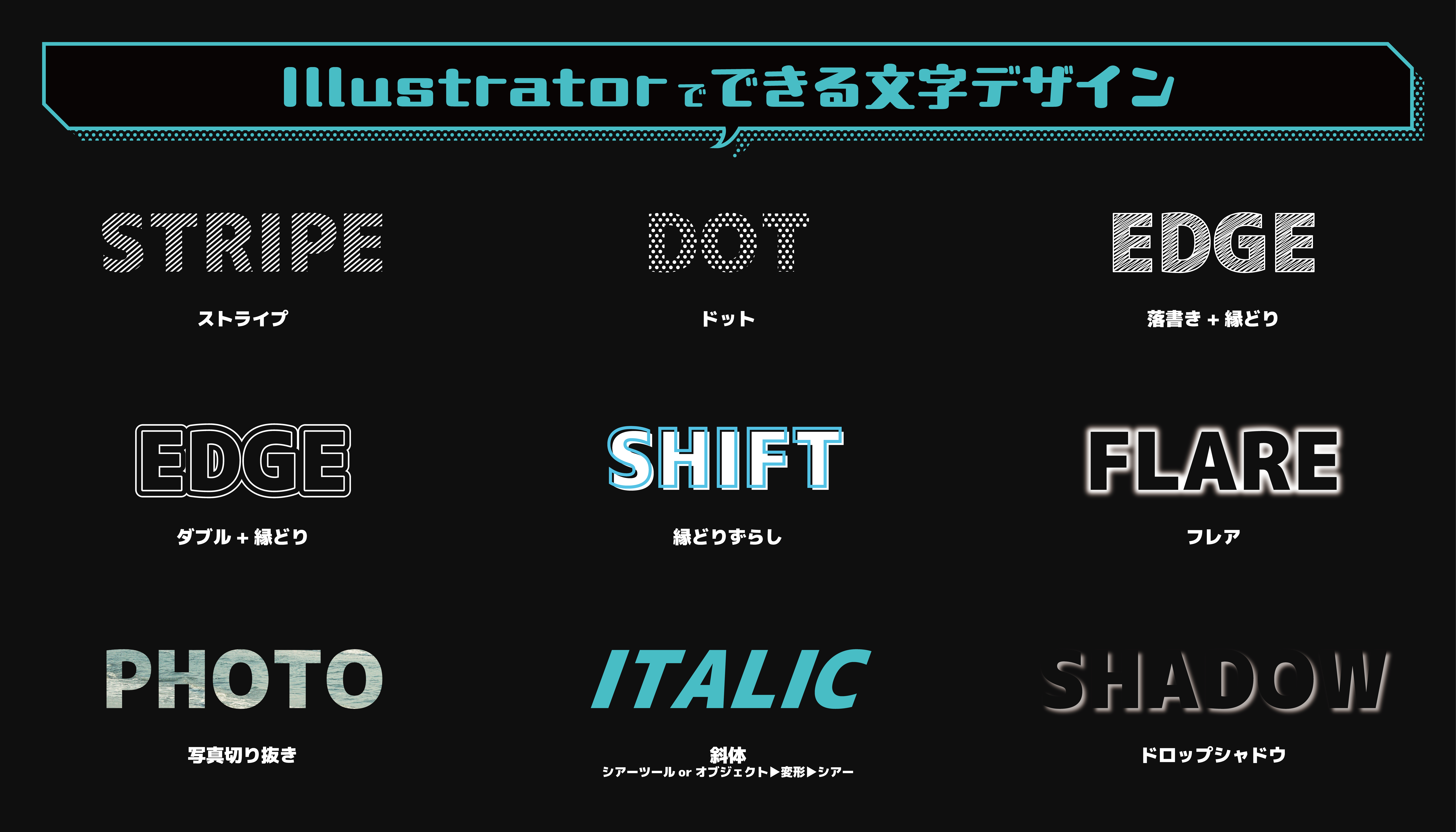 イラストレーターの機能を組み合わせることで、簡単にかっこいいタイトルデザインが作成可能です。デザインに迷った時や、なんか足りないなと思った時の参考にしてみてください!