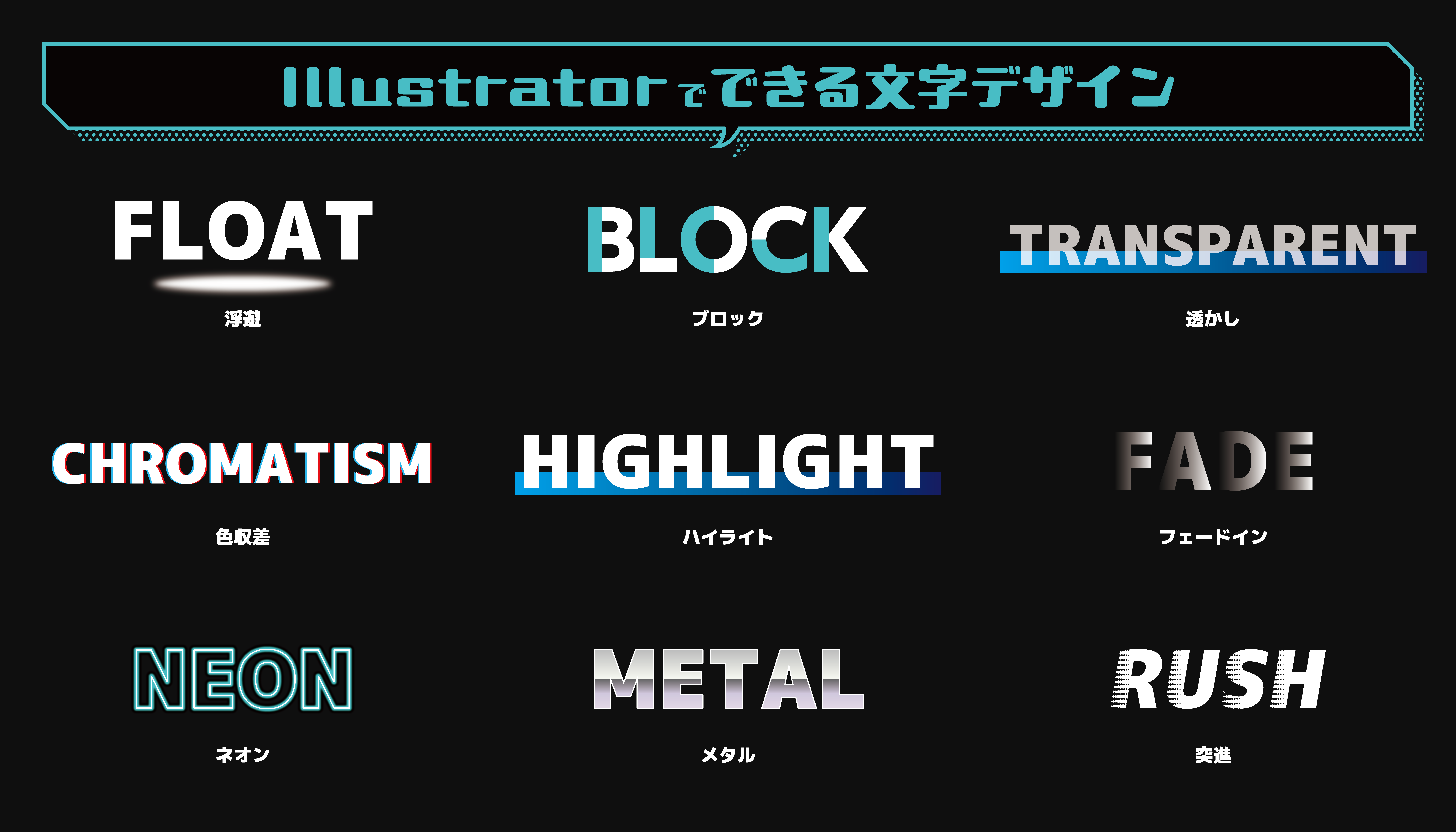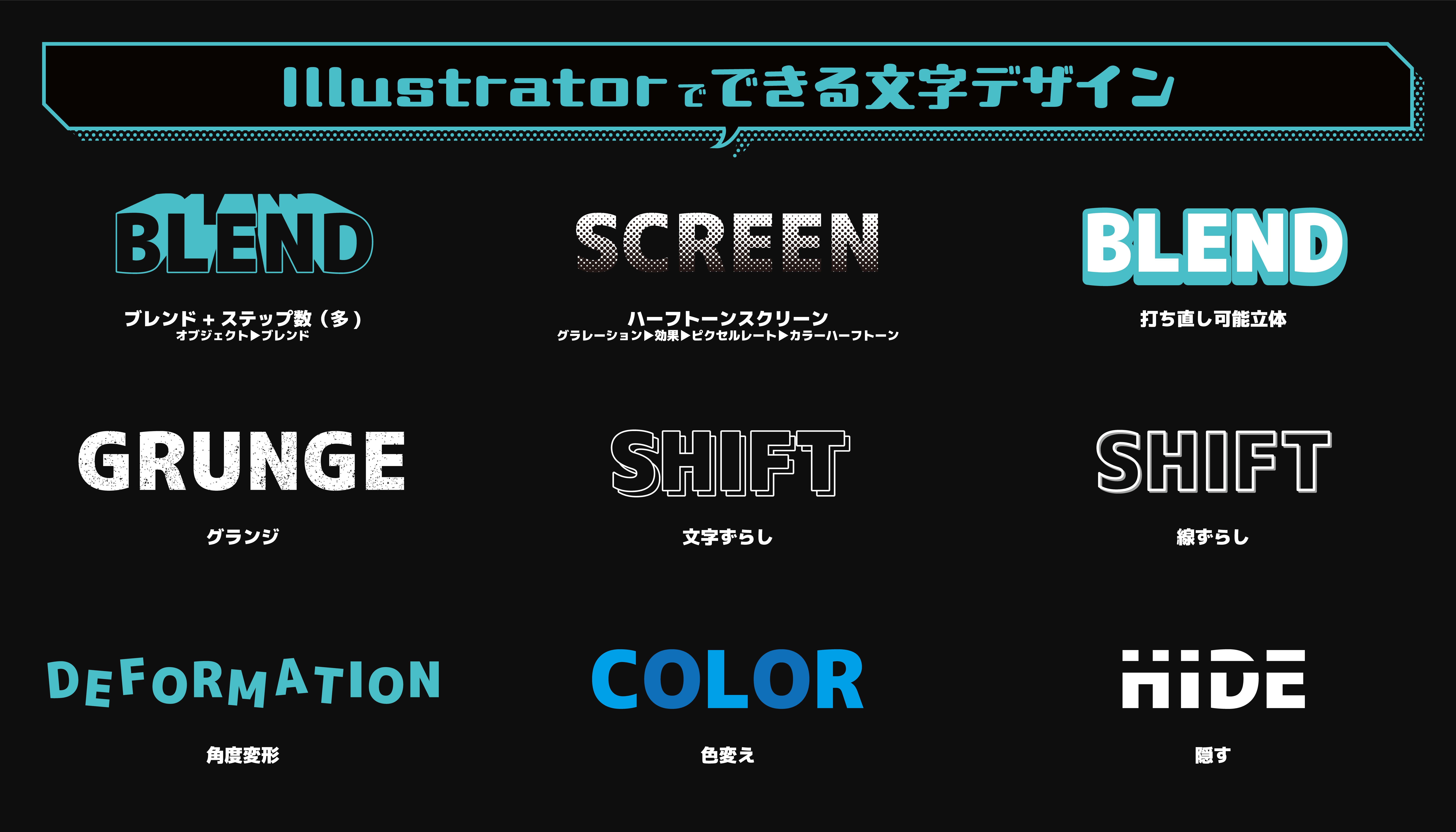 イラストレーターの機能を組み合わせることで、簡単にかっこいいタイトルデザインが作成可能です。デザインに迷った時や、なんか足りないなと思った時の参考にしてみてください!