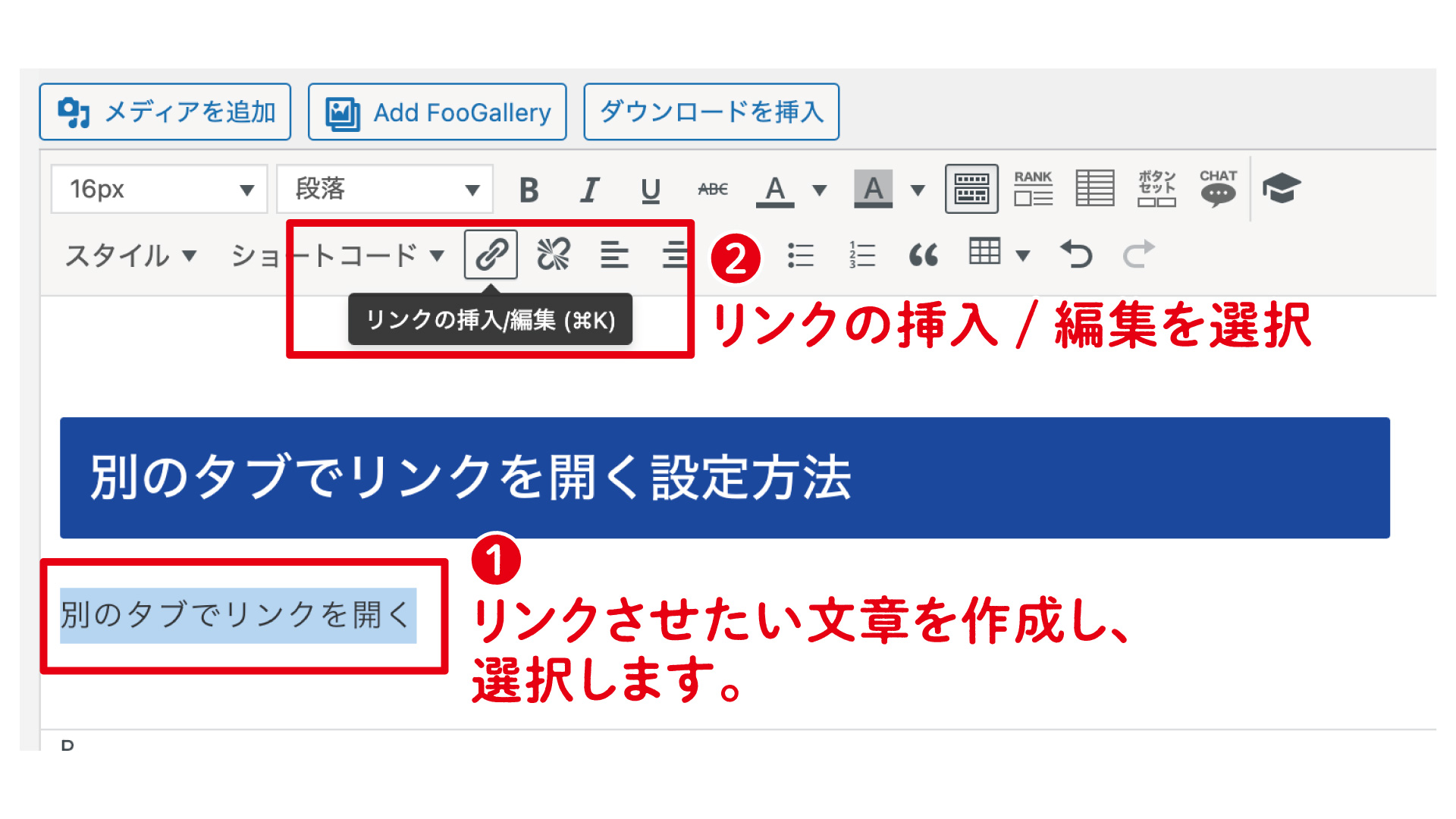 するとリンクされた文章をクリックしたとき、リンク先が新しいタブで開くようになります。
