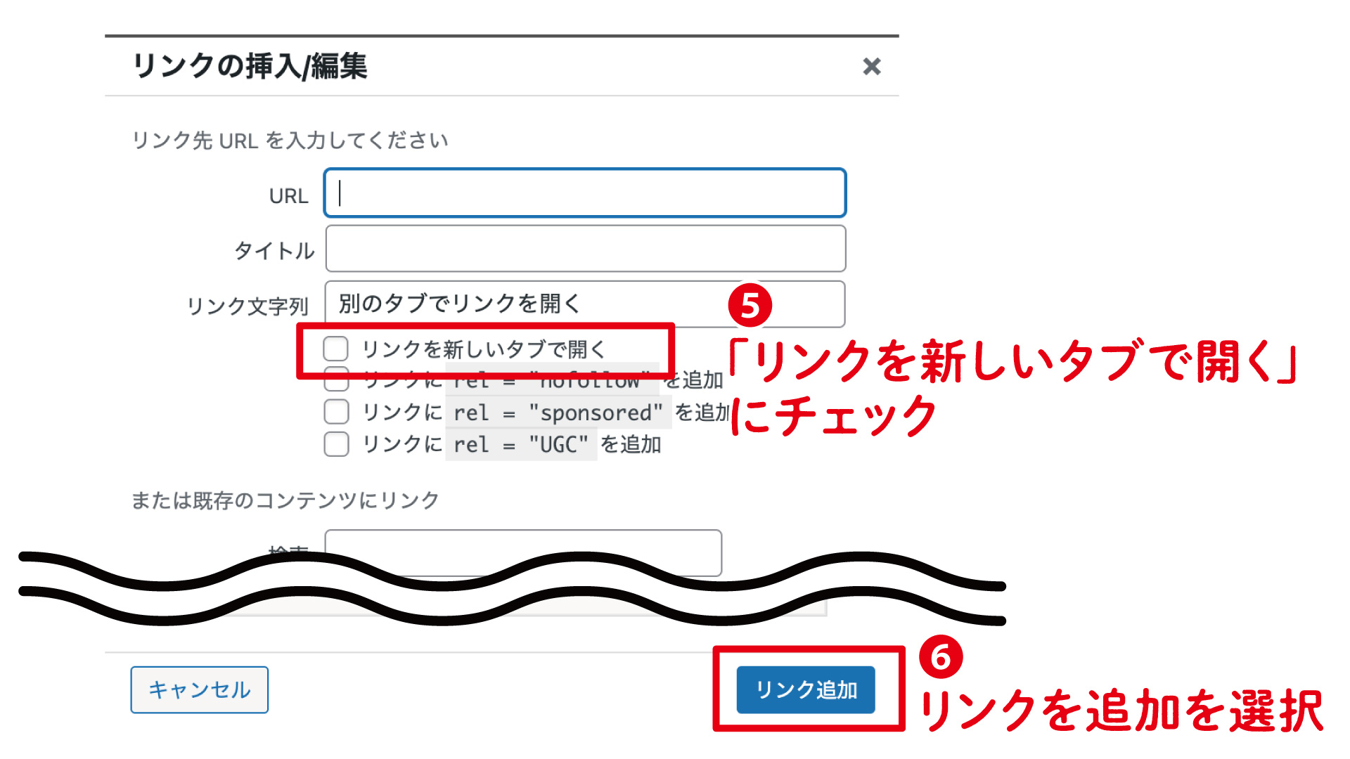 詳細設定を開いたら「 リンクを新しいタブで開く」にチェックを入れリンクを追加を選択。